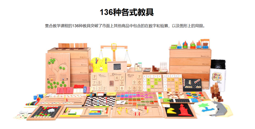 课程由136种各类教具和上百种游戏玩法构成,涵盖从幼儿阶段到小学阶段,无需频繁更换课程,就能够让孩子连续地、系统地完成学习。